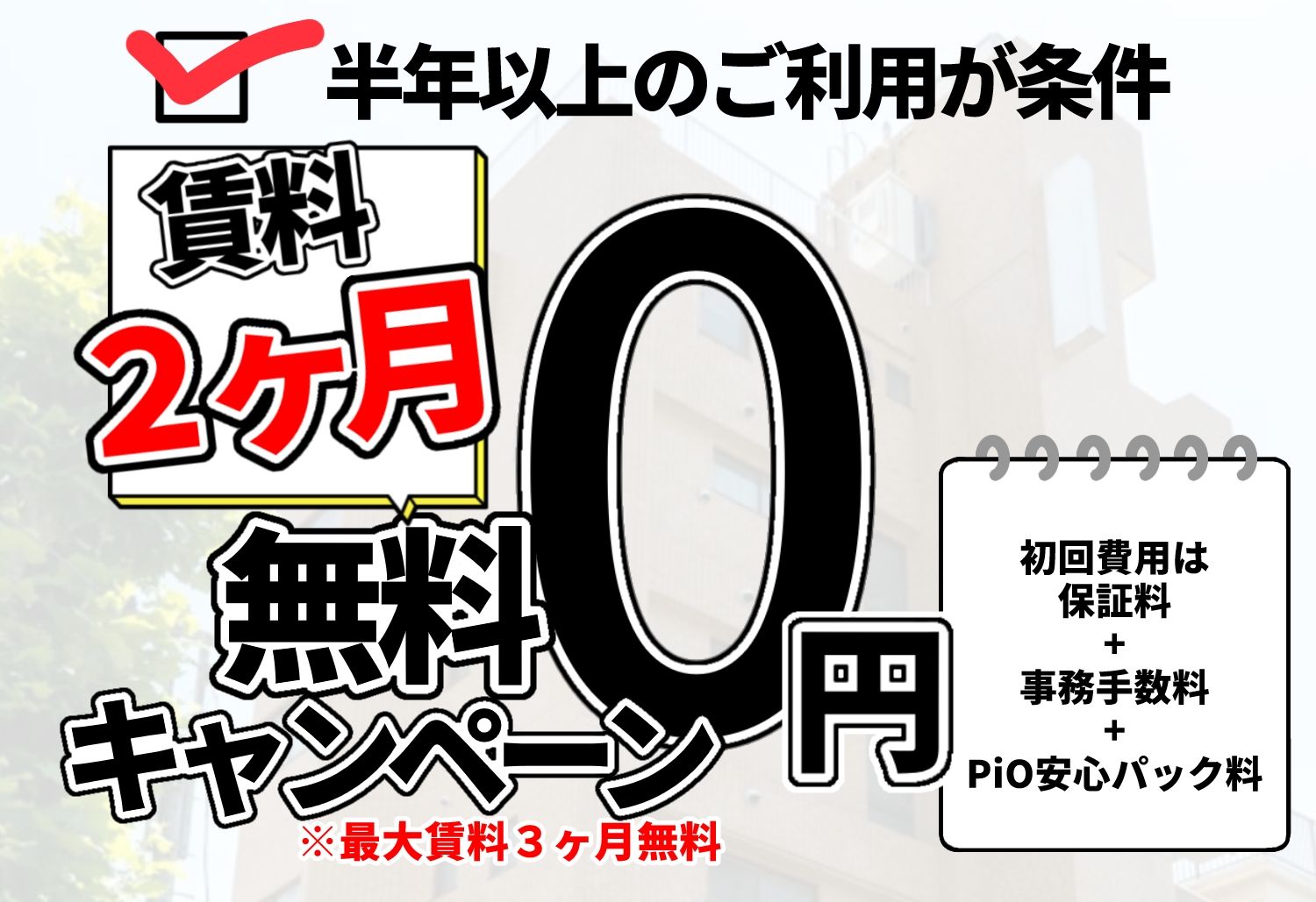 ※翌年以降の年間保証料(賃料とPiO安心パックの約0.5ヶ月分)は、賃貸保証会社パルマから送付されるコンビニ支払ハガキでお支払いただきます。